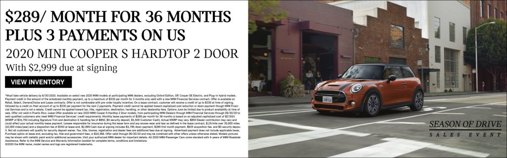 MINI Cooper S Hardtop 2 Door: 180 days no payment + $289/ month for 36 months $2,999 due at signing