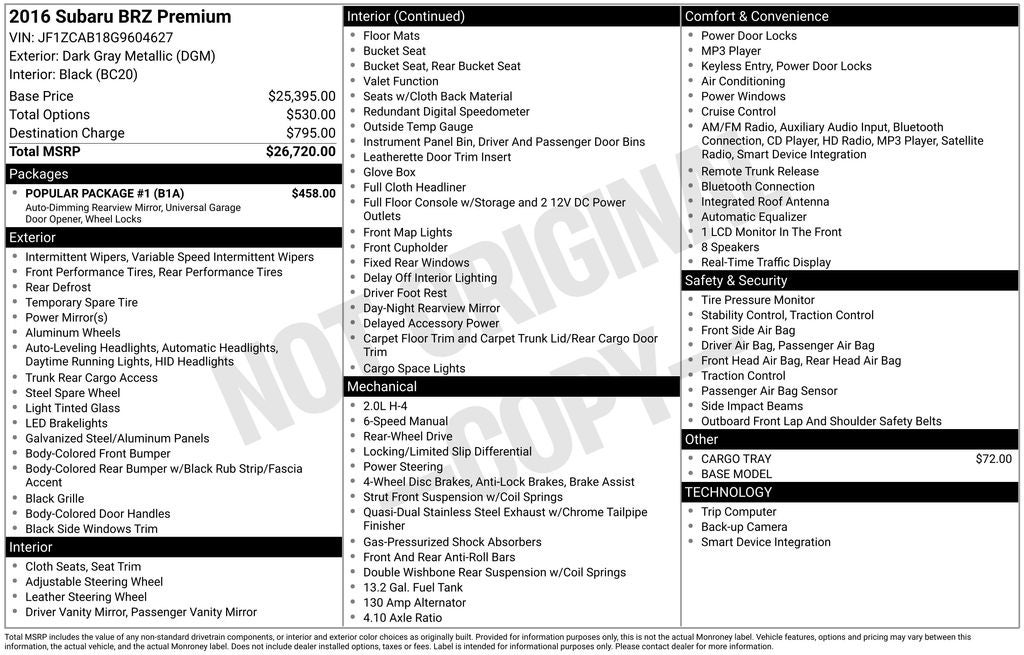 2016 Subaru BRZ Premium Dark Gray Metallic 2.0L 4-Cylinder DOHC 16V RWD 6-Speed manual.