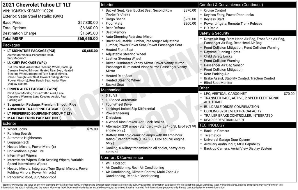 With its exceptional condition, comprehensive list of features, and one-owner Carfax history, this 2021 Chevrolet Tahoe LT is an exceptional value. Don't miss your chance to experience the power, comfort, and technology that this remarkable SUV has to offer.