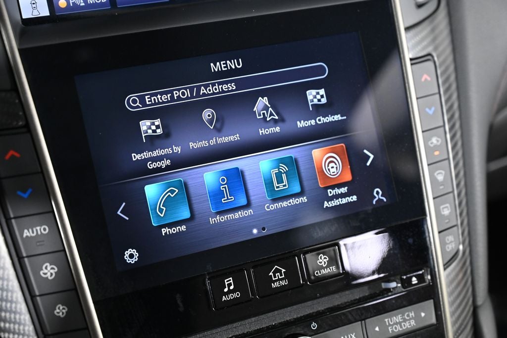 - Radio: INFINITI InTouch w/Navigation -inc: 16 speaker Bose Performance Series audio w/Bose Centerpoint simulated surround, navigation w/lane guidance, 3D building graphics, premium traffic and MapCare, voice recognition for navigation functions, including 1-shot voice destination entry, Apple CarPlay, Siri Eyes Free, Android Auto, Bluetooth® hands-free phone system w/text messaging assistant, voice recognition for audio, Bluetooth® and vehicle information, streaming audio via Bluetooth®, 2 illuminated USB connection ports (1 type A, 1 type C), auxiliary audio input, SiriusXM radio w/advanced audio features w/3-month complimentary trial, SiriusXM Traffic w/3 month complimentary trial access to real-time traffic information, SiriusXM Travel Link w/3 month complimentary trial access to weather, fuel prices, stock prices, sports scores, movie listings and parking and Wi-Fi hotspot