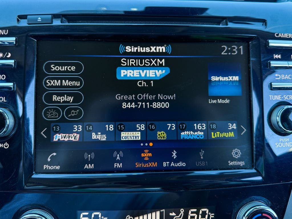 - Radio: AM/FM/CD/MP3/WMA Audio System -inc: Bose premium audio system w/11 speakers plus dual driver subwoofer, NissanConnect w/navigation featuring Apple CarPlay and Android Auto, Nissan door to door navigation w/3D building graphics and satellite imagery, connected navigation features including online POI search, door-to-door and online premium traffic information, SiriusXM Travel Link (weather, fuel prices, movie listings, stock info, sports and parking), SiriusXM Traffic, auxiliary audio input jack, SiriusXM satellite radio, A-IVI 8" display, 2 front illuminated USB connection ports (1 type-A, 1 type-C) for iPod interface and other compatible devices, Bluetooth® hands-free phone system, streaming audio via Bluetooth®, hands-free text-messaging assistant, Siri Eyes Free and 2 rear illuminated USB charge ports (1 type-A, 1 type-C)