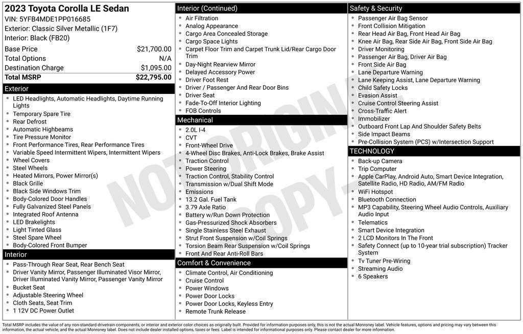 Whether you're commuting to the office, embarking on a road trip, or simply running errands, this 2023 Toyota Corolla LE is the perfect companion. Backed by a Passed Dealer Inspection, Recent Oil Change, and Vehicle Detailing, this meticulously maintained vehicle is ready to provide you with years of reliable and enjoyable driving.