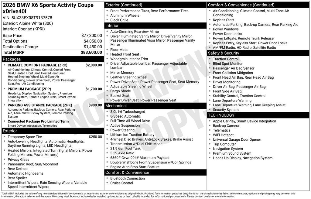 Elevate your driving experience with the BMW X6's comprehensive suite of advanced features, including the Parking Assistance Package with Automatic Park Assistant, Active Park Distance Control, and Parking View with 3D Surround View. Enjoy the ultimate in comfort and convenience with the Climate Comfort Package, offering 4-Zone Automatic Climate Control, Front Ventilated Seats, and Heated Front Seats with Armrests and Steering Wheel.